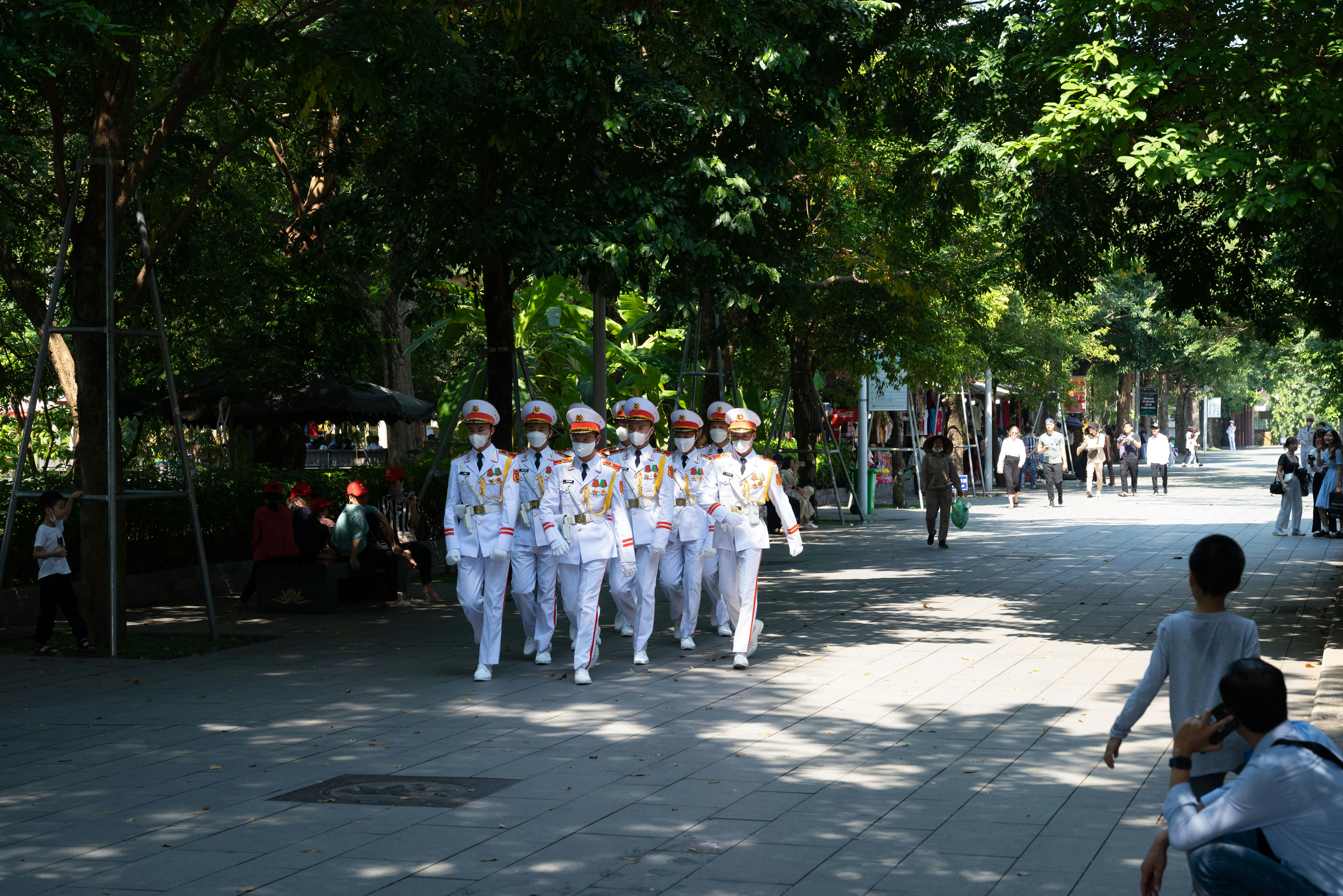 Trước giờ diễu binh, tôi lật đật đi bộ từ ngoài vào để đến được chỗ bố tôi. Ngày hôm ấy người ta chặn đường cấm xe. Dân tình đến xem phải dạt sang hai bên đường, phía sau những hàng rào sắt kiên cố; hoặc nơi nào không có thì người ta cũng có đội an ninh đưa dân lên vỉa hè. Một anh bộ đội dắt tôi đi, vì hồi ấy tôi còn bé quá, biết đường đâu. Vỉa hè chật cứng người rồi thì anh dắt tôi đi xuống đường. Dù sao thì vẫn chưa đến giờ mít-tinh.